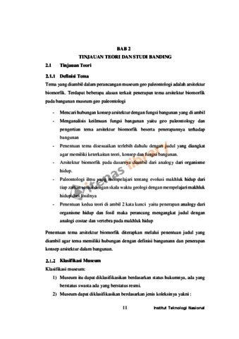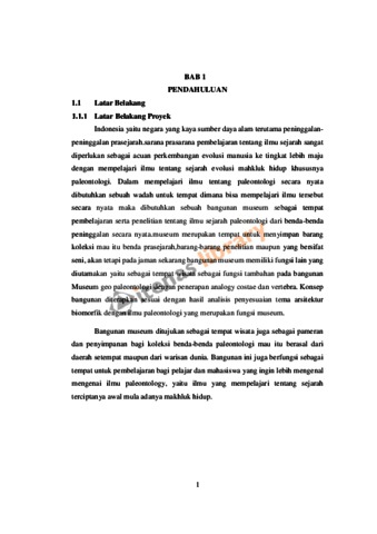 Indonesia yaitu negara yang kaya akan sumber daya alam terutama peninggalanpeninggalan prasejarah terutama tentang paleontologi. Mempelajari ilmu tentang paleontologi secara nyata dibutuhkan sebuah wadah untuk tempat dimana bisa mempelajari ilmu tersebut secara nyata maka dibutuhkan sebuah bangunan museum sebagai tempat pembelajaran serta penelitian tentang ilmu sejarah paleontologi dari benda-benda peninggalan. Museum merupakan tempat untuk menyimpan barang koleksi mau itu benda prasejarah, barang-barang penelitian maupun yang bersifat seni, akan tetapi pada jaman sekarang bangunan museum memiliki fungsi lain yang diutamakan yaitu tempat wisata sebagai fungsi tambahan pada bangunan. Lokasi tapak berada di kawasan masterplan kota baru parahyangan, padalarang bandung barat merupakan tempat yang strategis dan dapat dicapai melalui jalan raya padalarang sehingga cocok dijadikan tempat pariwisata. Tema yang dipilih pada museum adalah arsitektur biomorfik, Arsitektur biomorfik merupakan jenis penerapan konsep bangunan dengan menganalogikan sesuatu objek dari organisme hidup maka yang diambil oleh perancang merupakan analogical dari fosil makhluk hidup. teori fosil memberikan kesan bahwa bangunan museum memiliki umur bangunan yang jangka panjang entah itu penerapan dari struktur, fasad, taman, interior ataupun bentuk bangunan Konsep bangunan yang diambil oleh perancang adalah analogy.analogy bangunan yang akan di ambil dari teori fosil adalah fosil tulang costae dan vertebra pada tulang hewan reptil yaitu ular.