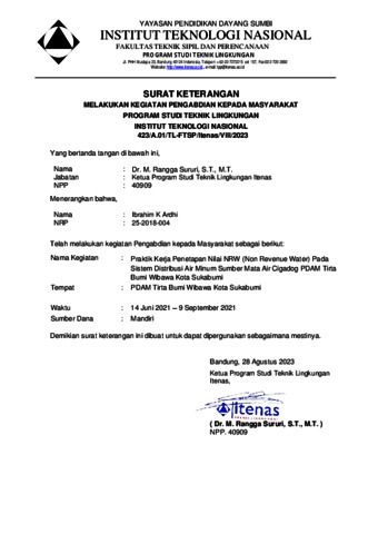 Ardhi, Ibrahim Kusuma (2022) LAPORAN PKM - PENETAPAN NILAI NRW (NON REVENUE WATER) PADA SISTEM DISTRIBUSI AIR MINUM SUMBER MATA AIR CIGADOG PDAM TIRTA BUMI WIBAWA KOTA SUKABUMI. Project Report. Institut Teknologi Nasional, Bandung, Bandung.