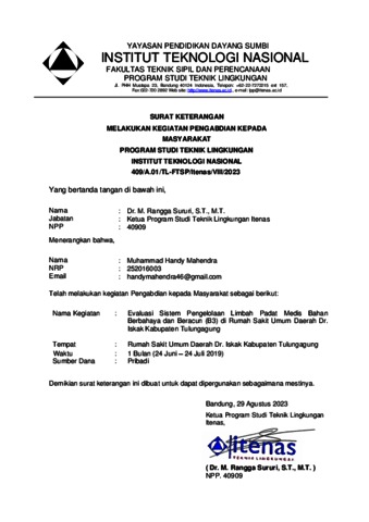 MAHENDRA, MUHAMMAD HANDY (2020) LAPORAN PKM - EVALUASI SISTEM PENGELOLAAN LIMBAH PADAT MEDIS BAHAN BERBAHAYA DAN BERACUN (B3) DI RUMAH SAKIT UMUM DAERAH DR. ISKAK KABUPATEN TULUNGAGUNG. Project Report. Institut Teknologi Nasional, Bandung, Bandung.