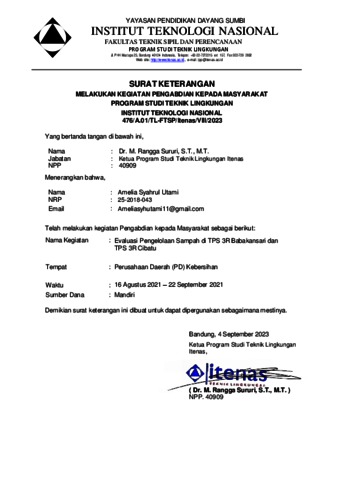 UTAMI, AMELIA SYAHRUL (2023) LAPORAN PKM - EVALUASI PENGELOLAAN SAMPAH DI TPS 3R BABAKANSARI DAN TPS 3R CIBATU. Project Report. Institut Teknologi Nasional, Bandung, Bandung.
