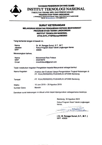 FIRDAUS, MUHAMMAD RAIS (2023) LAPORAN PKM - ANALISIS DAN EVALUASI UPAYA PENGENDALIAN TINGKAT KEBISINGAN DI PT. PLN (PERSERO) PUSHARLIS UP2WIII BANDUNG. Project Report. Institut Teknologi Nasional, Bandung, Bandung.