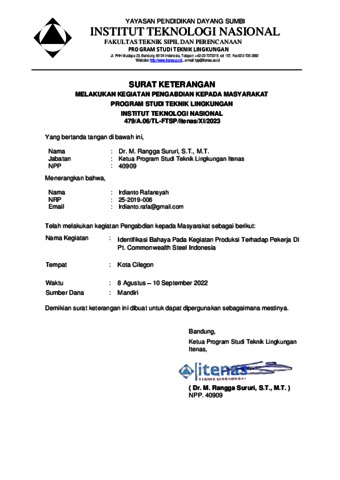 RAFANSYAH, IRDIANTO (2023) LAPORAN PKM - IDENTIFIKASI BAHAYA PADA KEGIATAN PRODUKSI TERHADAP PEKERJA DI PT. COMMONWEALTH STEEL INDONESIA. Project Report. Institut Teknologi Nasional, Bandung, Bandung.