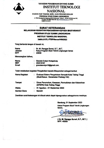Hutagalung, Gracela Evelyn (2023) LAPORAN PKM - EVALUASI SISTEM PENGELOLAAN SAMPAH KOTA TEBING TINGGI (Studi Kasus Kecamatan Padang Hilir). Project Report. Institut Teknologi Nasional, Bandung, Bandung.