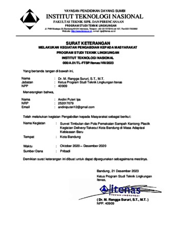 Ipa, Andini Puteri LAPORAN PKM - SURVEI TIMBULAN DAN POLA PEMAKAIAN SAMPAH KANTONG PLASTIK KEGIATAN DELIVERY/TAKEOUT KOTA BANDUNG DI MASA ADAPTASI KEBIASAAN BARU. Project Report. Institut Teknologi Nasional, Bandung, Bandung.