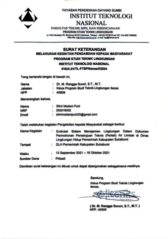 Putri, Silmi Madani LAPORAN PKM - EVALUASI SISTEM MANAJEMEN LINGKUNGAN DALAM DOKUMEN PERMOHONAN PENERBITAN PERSETUJUAN TEKNIS (PERTEK) AIR LIMBAH DI DINAS LINGKUNGAN HIDUP PEMERINTAH KABUPATEN SUKABUMI. Project Report. Institut Teknologi Nasional, Bandung, Bandung.