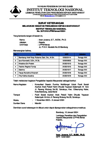 Zael, Bambang Arief Ruby Rubama and Kusnaedi, Iyus and Pratiwi, Khalisha Giri and TurniP, Festino Reginal and , Sabrina and Fasya Nurzahra, Ahsanah and Firly Fathia, Azzahra LAPORAN PKM - KONSULTASI DESAIN FURNITUR MULTIFUNGSI UNTUK PANTI SOSIAL ASUHAN ANAK PEDULI YATIM DHUAFA SALAMIYAH DI KOTA BANDUNG. Project Report. Institut Teknologi Nasional, Bandung, Bandung.