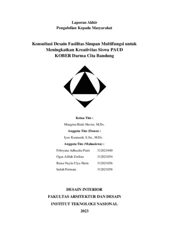 Havier, Maugina Rizki and Kusnaedi, Iyus and Putri, Febryana Adhaulia and Zerlina, Ogsa Afifah and Haris, Raisa Nayla Ulya and Permata, Indah (2023) Laporan PKM - Konsultasi Desain Fasilitas Simpan Multifungsi untuk Meningkatkan Kreativitas Siswa PAUD KOBER Darma Cita Bandung. Project Report. Institut Teknologi Nasional, Bandung, Bandung.