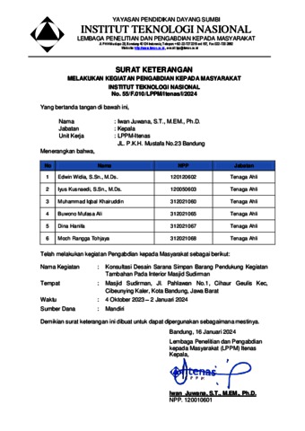 Widia, Edwin and Kusnaedi, Iyus and Khairuddin, Muhammad Iqbal and Ali, Buwono Mufasa and Hanifa, Dina and Tohjaya, Moch Rangga (2023) LAPORAN PKM - KONSULTASI DESAIN SARANA SIMPAN BARANG PENDUKUNG KEGIATAN TAMBAHAN PADA INTERIOR MASJID SUDIRMAN. Project Report. Institut Teknologi Nasional, Bandung, Bandung.