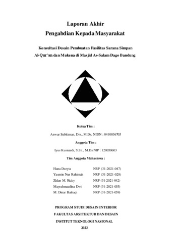 Subkiman, Anwar and Kusnaedi, Iyus and Dezyta, Hana and Rahimah, Yasmin Nur and Rizky, Zidan M. and Dwi, Mayrahmaulina and Baihaqi, M. Dinar (2023) Laporan PKM - Konsultasi Desain Pembuatan Fasilitas Sarana Simpan Al-Qur’an dan Mukena di Masjid As-Salam Dago Bandung. Project Report. Institut Teknologi Nasional, Bandung, Bandung.