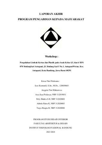 Kusnaedi, Iyus and Prakasya, Arya Jaya and S.H,, Firly Zhahra and K, Adinda Raisa and R,, Tasya Rizqita (2023) Laporan PKM - Pengolahan Limbah Kertas dan Plastik pada Anak Kelas 4,5, dan 6 SDN 078 SindangSari Antapani, Jl. Sindang Sari I No.1, AntapaniWetan, Kec. Antapani, Kota Bandung, Jawa Barat 40291. Project Report. Institut Teknologi Nasional, Bandung, Bandung.