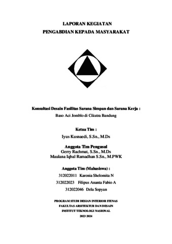 Kusnaedi, Iyus and Rachmat, Gerry and Ramadhan, Maulana Iqbal and Shelomita N, Karenia and Fabio A, Filipus Ananta and Sopyan, Dela (2024) Laporan PKM - Konsultasi Desain Fasilitas Sarana Simpan dan Sarana Kerja : Baso Aci Jomblo di Cikutra Bandung. Project Report. Institut Teknologi Nasional, Bandung, Bandung.