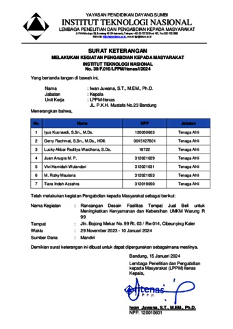 Kusnaedi, Iyus and Rachmat, Gerry and Wardhana, Lucky Akbar Raditya and Anugra M. P., Juan and Wulandari, Vivi Hamidah and Maulana, M. Rizky and Azzahra, Tiara Indah (2024) Laporan PKM - Konsultasi Desain : Rancangan Desain Fasilitas Tempat Jual Beli untuk Meningkatkan Kenyamanan dan Kebersihan UMKM Warung R 99. Project Report. Institut Teknologi Nasional, Bandung, Bandung.
