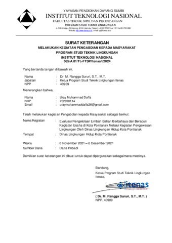 PUTRA, URAY MUHAMMAD DAFFA FIRDAUS MASAOKA LAPORAN PKM - EVALUASI PENGELOLAAN LIMBAH BAHAN BERBAHAYA DAN BERACUN KEGIATAN USAHA DI KOTA PONTIANAK MELALUI KEGIATAN PENGAWASAN LINGKUNGAN OLEH DINAS LINGKUNGAN HIDUP KOTA PONTIANAK. Project Report. Institut Teknologi Nasional, Bandung, Bandung.