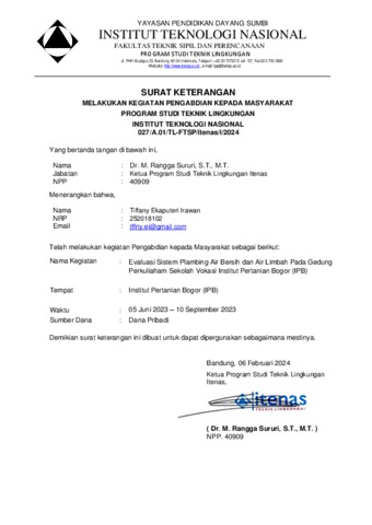 Irawan, Tiffany Ekaputeri (2024) LAPORAN PKM - EVALUASI SISTEM PLAMBING AIR BERSIH DAN AIR LIMBAH PADA GEDUNG PERKULIAHAN SEKOLAH VOKASI INSTITUT PERTANIAN BOGOR (IPB). Project Report. Institut Teknologi Nasional, Bandung, Bandung.