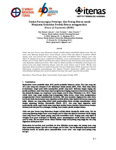 Liansari, Gita Permata and Desrianty, Arie and Tejaasih, Inten (2018) Usulan Perancangan Prototype Alat Potong Hewan untuk Menjamin Kehalalan Produk Hewan menggunakan House of Ergonomic (HOE). In: Seminar Nasional Rekayasa dan Desain Itenas 2018, Tema: Peranan Rekayasa dan Desain dalam Percepatan Pembangunan Nasional Berkelanjutan, 4 Desember 2018, Kampus Institut Teknologi Nasional - Bandung.