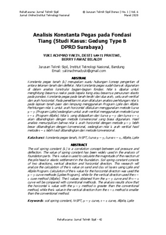 Yakin, Yuki Achmad and Pratiwi, Desti Santi and BILALDY, BERRY FAWAZ (2020) Analisis Konstanta Pegas pada Fondasi Tiang (Studi Kasus: Gedung Type B DPRD Surabaya). RekaRacana: Jurnal Teknik Sipil, 1 (6). pp. 42-53.