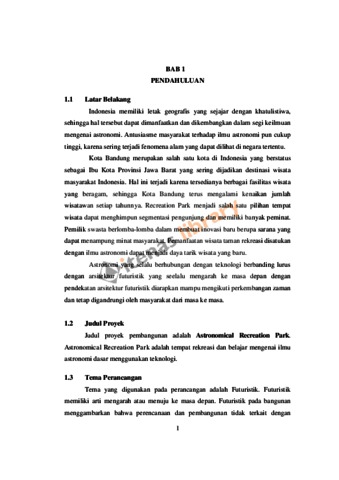 Indonesia memiliki letak geografis yang sejajar dengan khatulistiwa, sehingga hal tersebut dapat dimanfaatkan dan dikembangkan dalam segi keilmuan mengenai astronomi. Ketertarikan masyarakat terhadap ilmu atronomi cukup tinggi, tetapi kurangnya sarana untuk mengetahui ilmu astronomi dari hal yang paling dasar. Kota Bandung merupakan salah satu kota di Indonesia yang berstatus sebagai Ibu Kota Provinsi Jawa Barat yang sering dijadikan destinasi wisata masyarakat Indonesia. Hal ini dapat terjadi karena tersedianya berbagai fasilitas wisata yang beragam sehingga Kota Bandung terus mengalami kenaikan jumlah wisatawan local maupun mancanegara setiap tahunnya. Recreation Park menjadi tempat wisata utama karena dapat menghimpun semua segmentasi pengunjung sehingga selalu memiliki banyak peminat. Kondisi tersebut mendorong terciptanya taman rekreasi dan pengembangan ilmu astronomi dalam satu tempat melalui pendekatan asritektur futuristik. Arsitektur futuristik yang selalu mengarah ke masa depan sehingga berbanding lurus dengan ilmu astronomi yang berkaitan degan teknologi canggih.